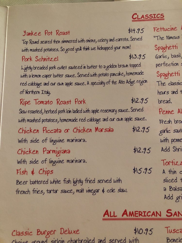 The Ripe Tomato, located in Malta, NY, offers a delightful mix of Italian, Seafood, and American cuisine. This charming establishment provides a range of amenities such as reservations, takeout, delivery, vegan options, and vegetarian choices. The ambiance is described as quaint and old-school with friendly and attentive staff. Customers rave about dishes like the scallop shrimp bisque, haddock almondine, and chicken parm, all featuring generous portions and homemade desserts. The linguine and clam sauce and seafood fra diavolo are highlighted as standout items. The cozy atmosphere and excellent service make for a highly satisfying dining experience. With its emphasis on fresh ingredients and homemade dishes, The Ripe Tomato is a must-visit for those seeking classic, flavorful meals in a welcoming setting.